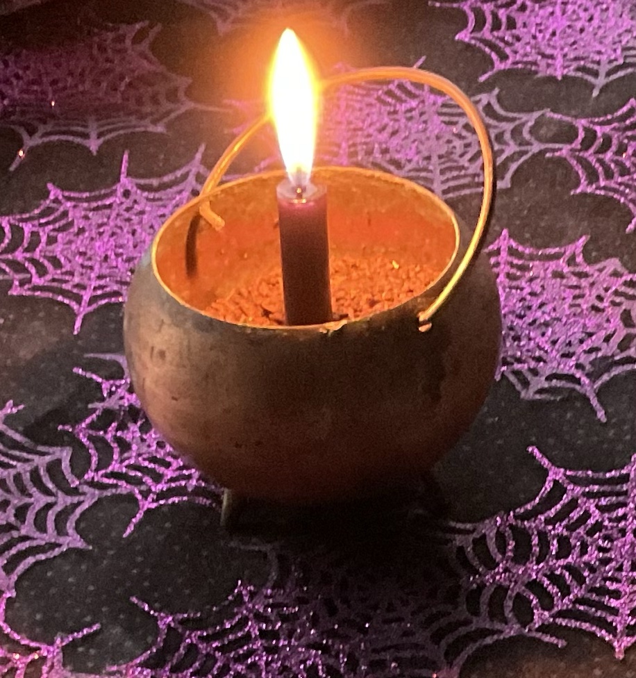 Fireproof container like a cast iron cauldron with clean kitty litter to stick candle in (easy clean up after ritual)