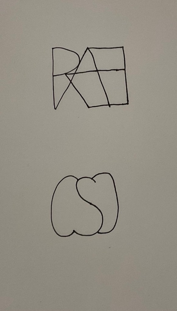 Try putting letters together to create a symbol. Play around with the letters, use some or all of them, and use capital or small letters. Here are a couple of examples: (Demonstrate on large piece of paper.)