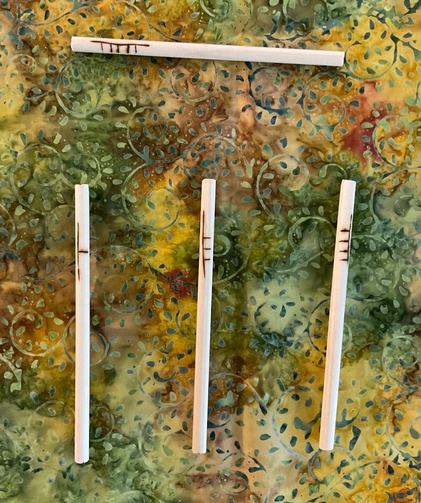You could also make wooden Ogam staves. You may use marker, paint, carve them or use a wood burner to create the marks. I like using a wood burner. If you decide to use a wood burner, please treat it with caution. The tip of my wood burner can get up to 425 degrees Fahrenheit so I treat it with care. Even after use and unplugging it, the wood burner will be hot for a little while. To get the feel for it I practiced with a cold wood burner first. Then I practice on a piece of scrap wood with a hot wood burner. I chose to use dowel rods of birch because birch is the first character of the Ogam alphabet. Also dowel rods are easy to work with and are available in birch. To learn more see video below.