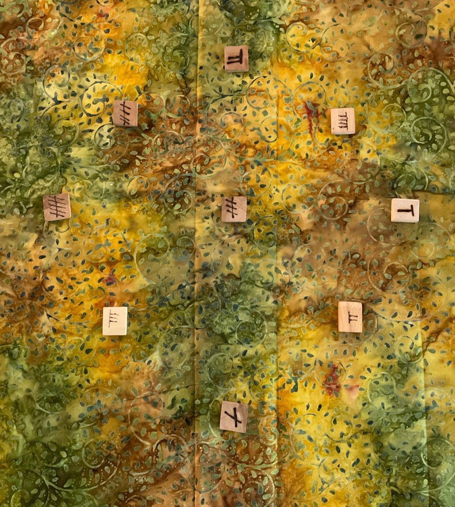Use paint, marker or a wood burner to create runes on wood tiles to create a set of runes or Ogam. When I made my first Ogam set, I did not have to, but I got as may of the different kinds of wood as I could. I chose a species of wood for those characters that corresponded with bushes or plants. See picture below.