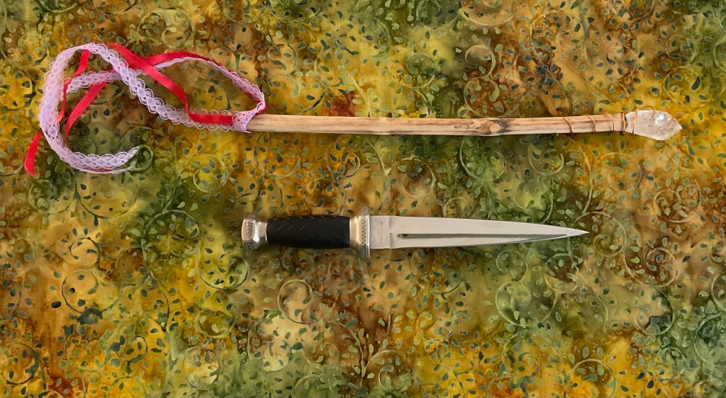 Besom – Otherwise known as a broom, this is another fantastic tool for clearing space. The bristles do not have to touch the floor to work, and an energetic sweeping motion is recommended. A handfasting includes the couple jumping over the besom. A besom is not to be used for physical cleaning. A besom is not hard to make. Deborah Blake gives instructions for making a besom. See Suggested Investigation.