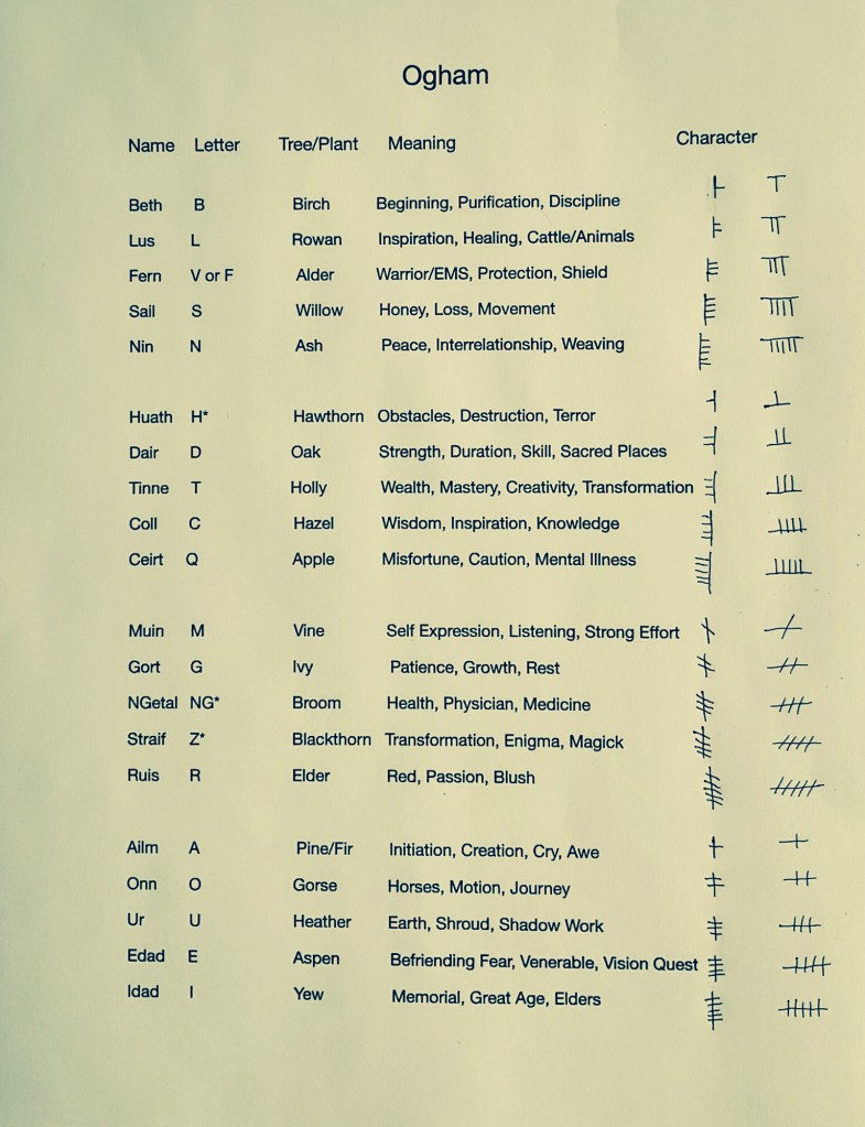 He points out several important pieces of information. According him only six of the letters in Ogham have tree meanings, which was news to me! What I understood from my research is that all the letters in the Ogham are based on trees. My books give me the 20 trees with which the 20 letters called feda (plural) or fid (singular) were based. Those six feda that have tree meanings are beith (birch), fern (alder), sail (willow), nin (ash), dair (oak) and coll (hazel). For example ruis (elder) does not have a meaning of elder as I have the association on my chart. (See below.) In fact ruis has a meaning of red. Lora O’Brien says that these letters have associations with trees but not have meanings based on trees. Therein lies the difference. Note that there are many other lists of associations. To learn more check out her YouTube video by clicking